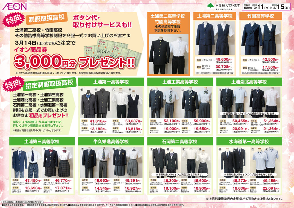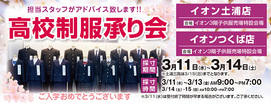 イオン土浦店・イオンつくば店【高校制服事前採寸承り会】を実施いたします。★事前にHP予約フォームからのご予約をお願いします。★採寸期間=2月26日(木)~3月10日(火)まで★お取り扱い制服=・イオン土浦店:土浦第一高等学校・土浦第二高等学校・土浦第三高等学校・竹園高等学校・土浦工業高等学校・土浦湖北高等学校・牛久栄進高等学校・石岡第二高等学校・イオンつくば店:土浦第一高等学校・土浦第二高等学校・土浦第三高等学校・竹園高等学校・土浦工業高等学校・牛久栄進高等学校・水海道第一高等学校【高校制服承り会】★採寸期間=:3月11日(水)~3月13日(金) 9:00~19:00。3月14日(土) 15日(日)10:00~19:00。※予約不可、ご来店順の採寸となります。・会場:イオン土浦店・つくば店=3階子供服売場特設会場。 詳細は 0120-973-138 まで!!【臨時休業のお知らせ】・荒川沖本店:3/9(月)~3/13(金)・学園店:3/11(水)~3/15(日)※採寸の為上記期間はお休みとなります。